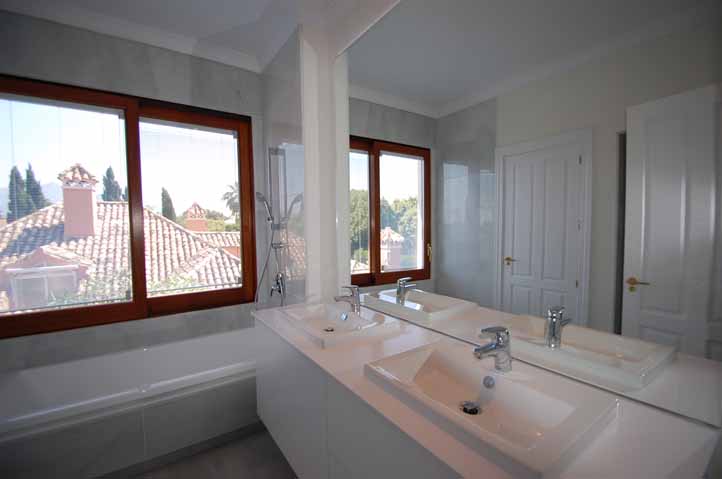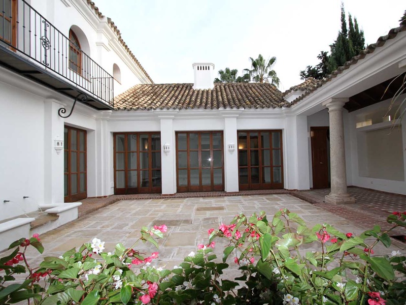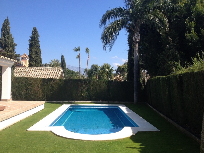 GUADALMINA BAJA, Prime location, totally refurbished fabulous andalucian style villa with fantastic mature gardens and tropical plants, interior patio with fountain, walking distance to the beach. Features: Modern kitchen with Siemens equipment, refurbished bathrooms, central water heating system, alarm system, garage for 2 cars with automatic doors. Renovated house in a typical Spanish-Andalusian style with pool, unfurnished