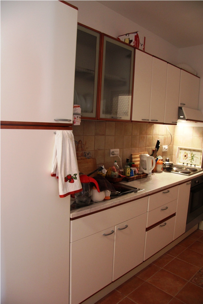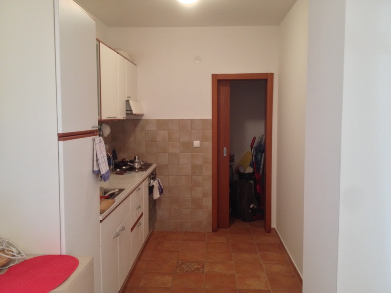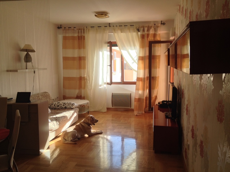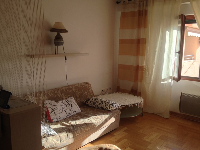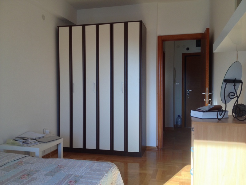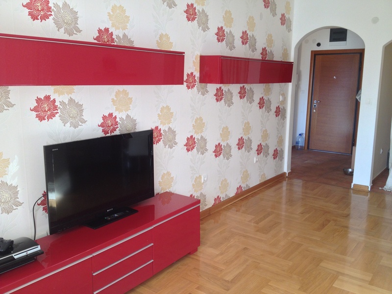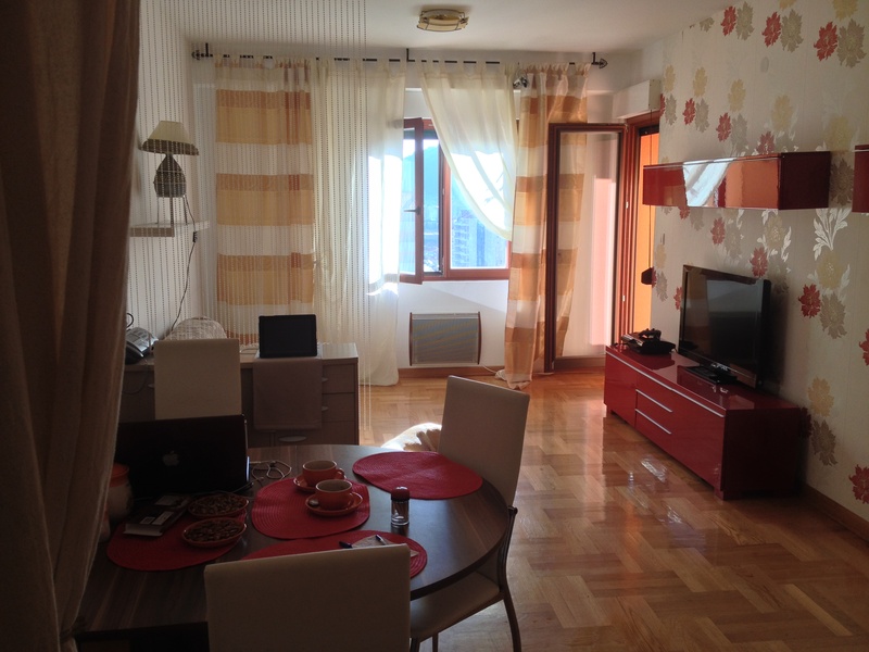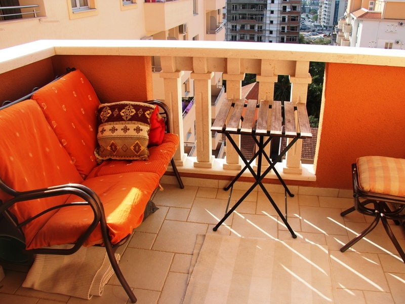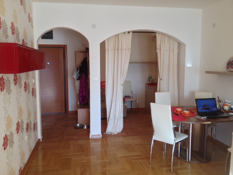 62 sq. meters, 7th floor in 10 store building, with an elevator, Rozino district, center of Budva, near the bus terminal. Nice green neighborhood, a lot of shops, cafes and restaurants. Big inner yard with green trees, a lot of space for kids to play. Safety. Apartment itself contains: • a balcony with furniture; • big kitchen with all necessary equipment: dishes, glasses, forks etc., big fridge with freezer, stove with an oven and air conditioning; • dining area; • big bathroom with washing machine; • bedroom with double bed; • Living area with big sofa and seats.