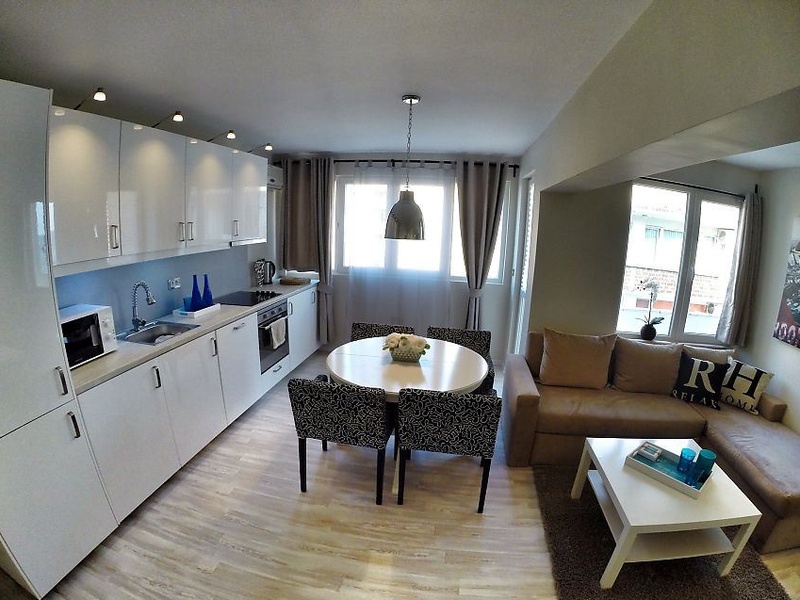 Апартамент с 1 спальней расположен на четвертом этаже, площадь – 54 кв.м; состоит из гостиной с кухней, спальни, коридора, ванной комнаты с душ-кабиной, балкона. Предлагается полностью меблированным и оборудованным.