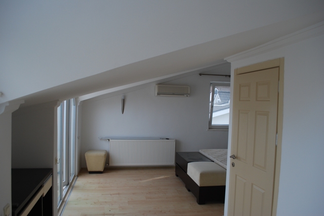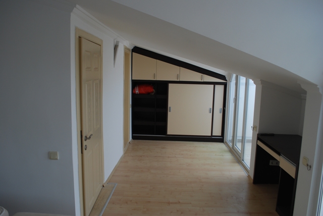 3 этаж : спальня со встроеными шкафами, рабочий стол, кровать с изголовьем, батарея, кондиционер, два балкона и сан узел с душевой кабиной.