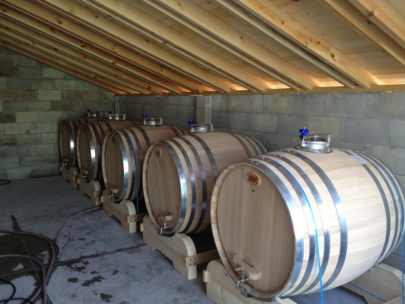 Под навесом избы поставлены 156  деревянных бочек, в которых созревает вино.