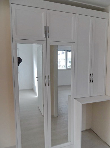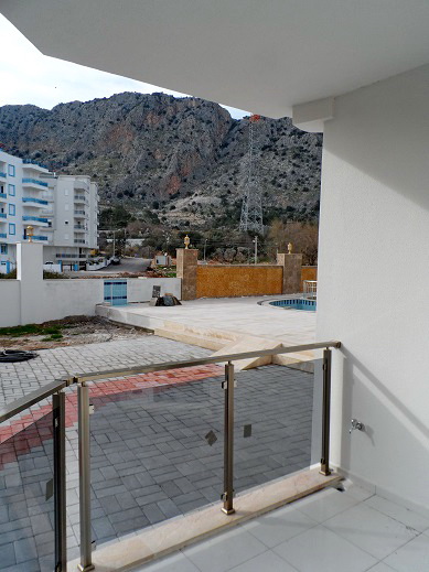 Квартира на первом этаже, кухня совмещена с салоном, установлена газовая плита, духовая печь, вытяжка, шкаф в прихожей, видео домофон, отдельные спальные комнаты, в ванной душ кабина, балкон с красивым видом на горы и бассейн, парк для машин.
