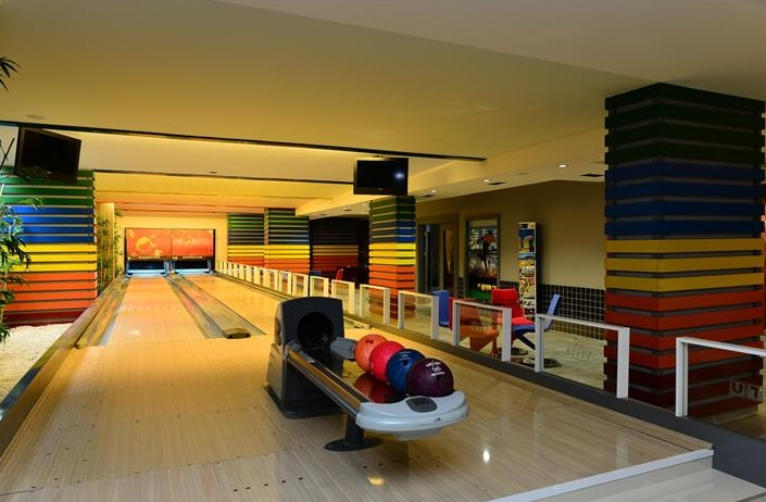 relax with friends at a bowling alley in the recreation area to have a picnic;