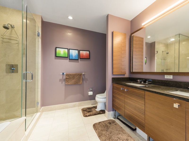 This penthouse unit features oak hardwood floors throughout, floor to ceiling windows, massive 12 foot ceilings, granite kitchen counter, stainless steel appliances, plenty of closet storage, marble bathroom floors, Kohler soaking tub, and a convenient washer and dryer included in unit. The master suite can easily fit a king sized bed with the second bedroom with a glass enclosed separate shower, bathtub, dual sinks, in the master bath.