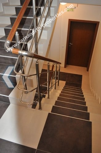 Лестничная площадка – пол с гранитогресом, деревянные перила