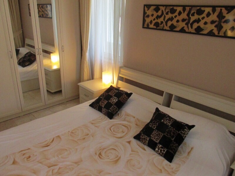 Квартира в очень хорошем состоянии, расположена на втором этаже с юго-западной стороны, площадью 120 м2, с двумя спальными комнатами, ванной, гостиной с кухонной зоной, балконами. Кроме мебели и техники, в каждой комнате установлен кондиционер. В доме есть свой бассейн, бар, консьерж, общий Wi-Fi.