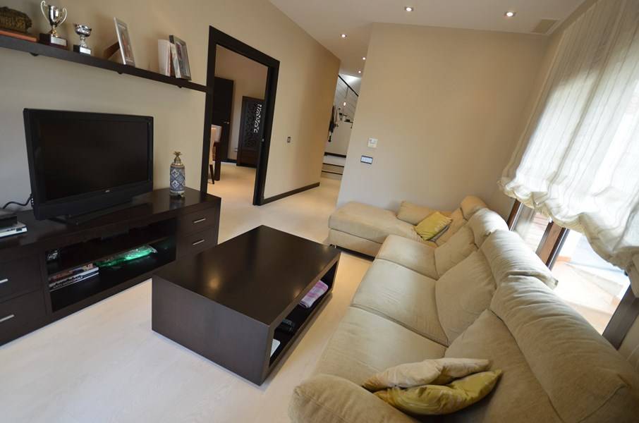 A brand new, very modern detached villa is located in a quiet and charming urbanization. It has a big-sized private pool, a garage for 2 cars, an air conditioning, security windows, solar panels. Ground floor has a living room, a separate dining room, luxury equipped kitchen, a breakfast area, an office, a toilet and a laundry. First floor has a master bedroom with en suite bathroom and a dressing room, a large terrace, 2 bedrooms, a guest bathroom. In the basement there is a separate apartment. It has a large living room with a bar area and an access to the patio and pool, the wine cellar, 2 bedrooms and a bathroom. Only 5 minutes drive to the beach and 8 minutes from the center of Fuengirola.