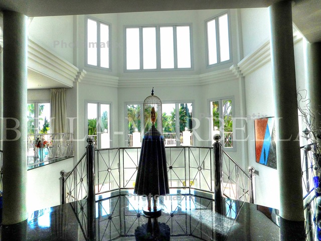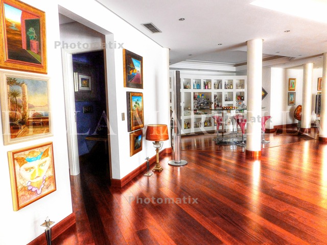 Two massiv marble stairs will bring you down to the second multifunctional hall. There is a bar, sitting areas and lounges and 3 more bedrooms en suite ,a laundry and storage room and a rightful private gym. One of the bedrooms in this floor has a small kitchen; this may be ideal as a staff apartment.