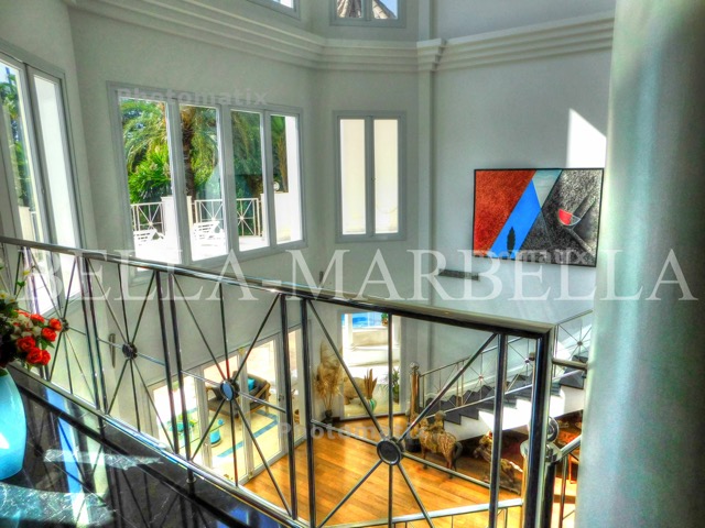 The entrance level offers a imposant hall with different lounges and sitting areas, a chimney and best views to the pool area trough a massiv and over 3 floors open gallery. On this floor is the master bedroom with a luxury bathroom, sauna and a walkable wardrobe. From the bedroom is a direct access to the huge balcony.