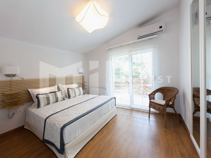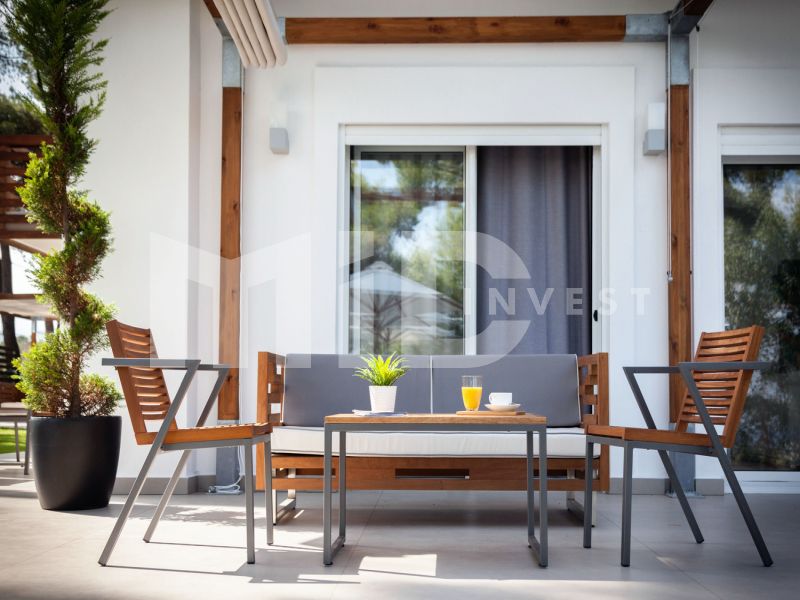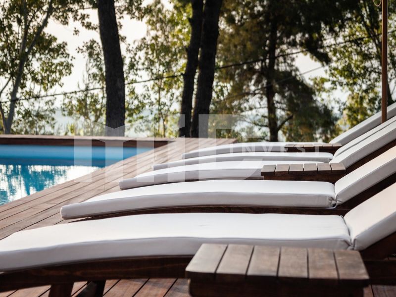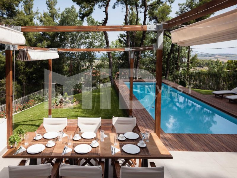 Super luxurious detached villa in Kassandra, Halkidiki, built in the middle of a pine forest, with amazing view to the sea. It consists of three levels of total floor area 345 sqm and has six bedrooms, three living rooms, two kitchens, playroom, four bathrooms and o WC. It is fully furnished and has a lovely garden. Specifically, the semi-basement (165 sqm) consists of a living room, kitchen, dining room, three bedrooms, two bathrooms and a playroom. The ground floor (115 sqm) has a living room with kitchen, a bedroom and a wc. The first floor (65 sqm) consists of a living room, two bedrooms and two bathrooms. There is a private swimming pool in the garden and an outdoors water massage/ Jacuzzi for 4 people. Extras: washing machine and dishwasher, refrigerator – freezer, oven, wood oven, microwave, espresso/cappuccino machine, High definition TV, air conditioning, cable and satellite TV, computer, DVD player, in-home theater, stereo system, high speed Wi Fi connection, video games console, safe. There are available towels and beach towels, shampoo and shower gel, three private sunbeds with an umbrella in front of the Sani Resort sandy beach and free entrance to Sani Resort. The house can accommodate up to 12 people. Cleaning/ Linen change: 2/week. The prices below are per week for the Low Season. For any further detail please contact our office. http://www.midinvest.gr/en/chalkidiki-kassandra-villa-1951/