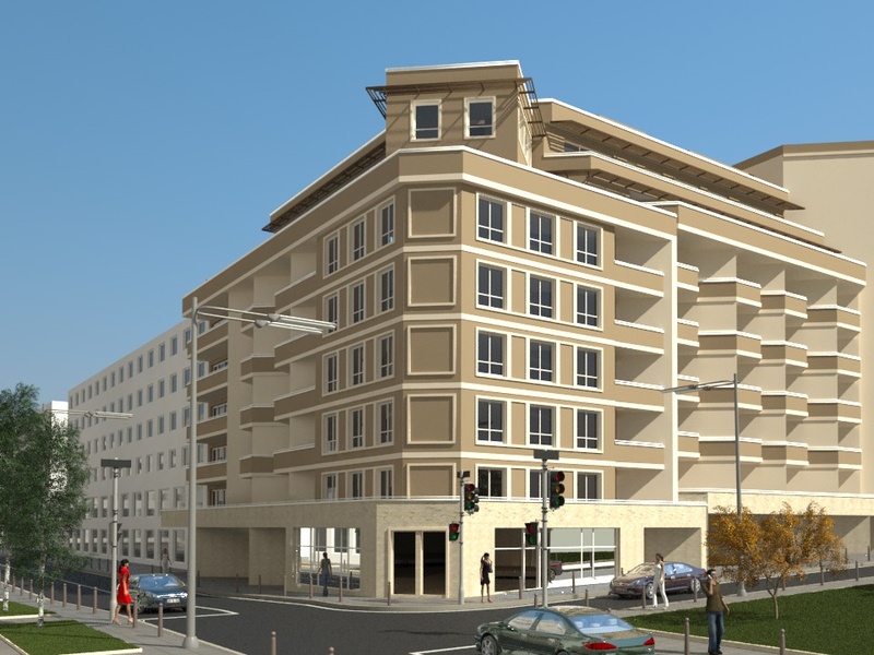 Здание имеет подвал, цокольный этаж и восемь этажей в трех отдельных входов с лифтами. Подвале и на первом этаже будут и гаражи и два магазина на первом этаже. В апартаментах есть одна или две спальни и студий.