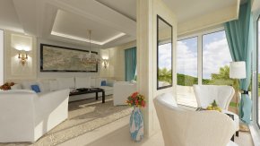 Предлагаются 179 квартир – квартиры-студии и квартиры с одной, двумя и тремя спальнями, площадью от 46 до 324 кв.м. Все квартиры предлагаются с отделкой „под ключ”: напольное покрытие – паркет, терракотовая плитка и ковролин по индивидуальному заказу; покраска потолков, покраска и обои на стенах, светильники и установлена сантехника в ванных комнатах и туалетах. Помещения общего пользования отделаны мрамором и ковролином на полу, на стенах будет использовано сочетание покраски и обоев в пастельных тонах, встроеннное освещение на потолке, картины, подчеркивающие стиль здания и панорамные окна как завершающая деталь.