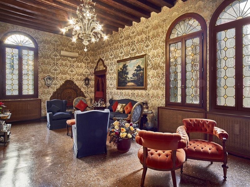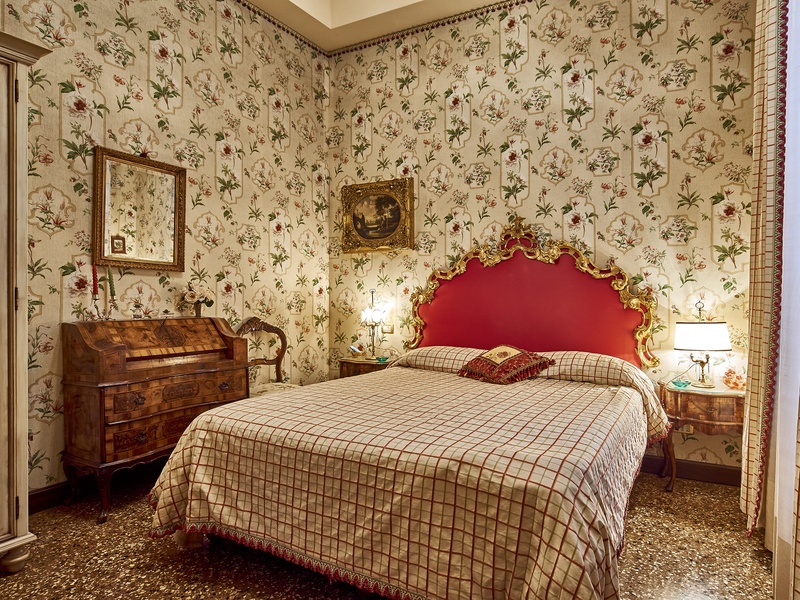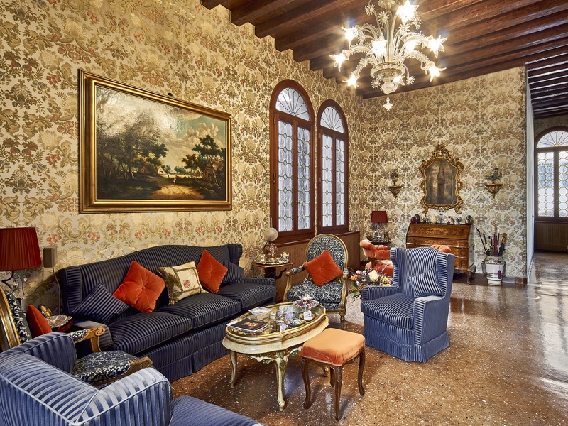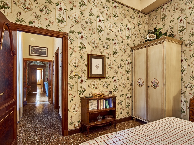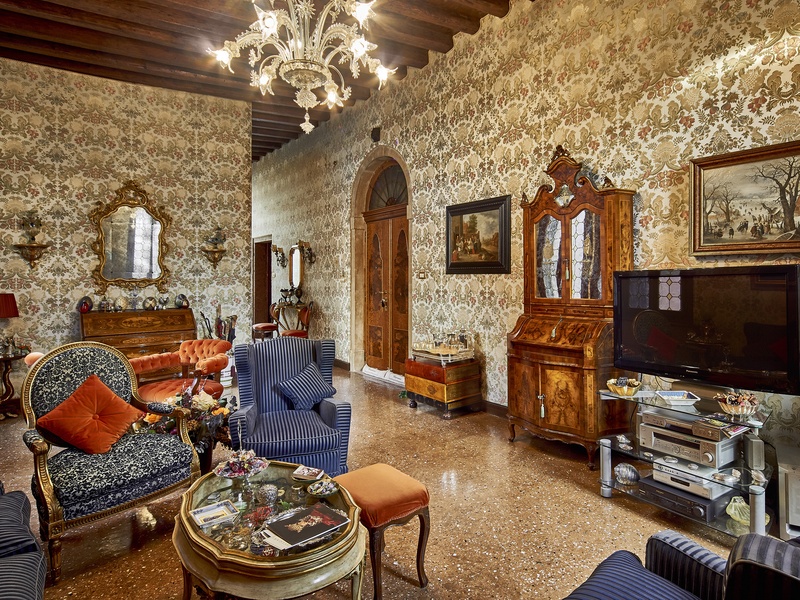 Bright and elegant Piano Nobile on the second floor of a small Venetian style Palazzo or ‘Palazzetto’. The apartment features high beamed ceilings and Venetian terrazzo flooring as well as beautiful fabric wall tapestries.