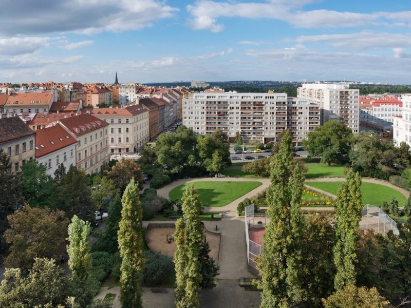 Тихий район с богатой инфраструктурой (школы, детские сады, магазины, почтовое отделение, рестораны и кафе) в досягаемости. Непосредственно на Жижковской площади расположена игровая площадка для детей и парк со скамейками. В нескольких минутах ходьбы находятся Маглеровы и Риегровы сады (Mahlerovy/Riegrovy sady), а также торговый центр Флора. Отличный доступ к центру города благодаря трамвайным остановкам «Ольшанская площадь» (Olšanské náměstí), «Радгоштьска» (Radhošt'ská) и станции метро «Йиржиго з Подебрад» (линия А).