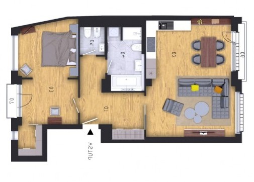 Квартира состоит из ориентированной на западную сторону гостиной с кухней, ориентированной на восточную сторону спальни с гардеробной и балконом с видом на тихий внутренний двор, далее ванной комнаты, отдельного туалета и прихожей. Квартира будет отремонтирована на высоком уровне, который будет включать в себя такие материалы, как итальянский мрамор, дубовые полы и первоклассную сантехнику.
