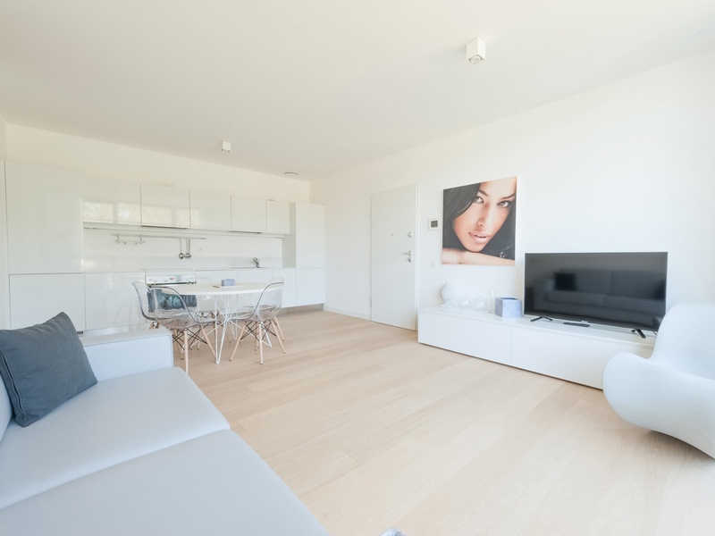 Total area of ​​apartments - 100 m2. Disposition: spacious and bright living room with kitchen and access to the terrace, 2 bedrooms, 2 bathrooms, car space in the underground parking, panoramic windows. The apartment has a modern kitchen Arclinea company, home appliances company Miele (electrical stove, fridge, dishwasher, washing machine), fully equipped bathrooms, electrical zatemnitelnye curtains and fitted wardrobes in the bedrooms there is a safe. The apartment has a system of "smart home", modern heating system .Walking distance from the complex there are shops, restaurants, shopping centers, tennis courts.