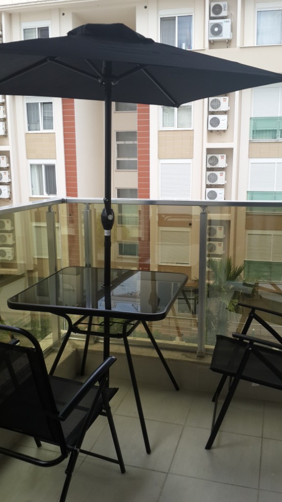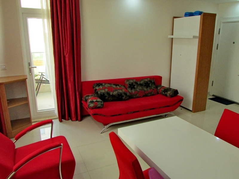 The living room has sofa-bed for 2 people, an armchair, a table with 4 soft chairs, TV, the conditioner.