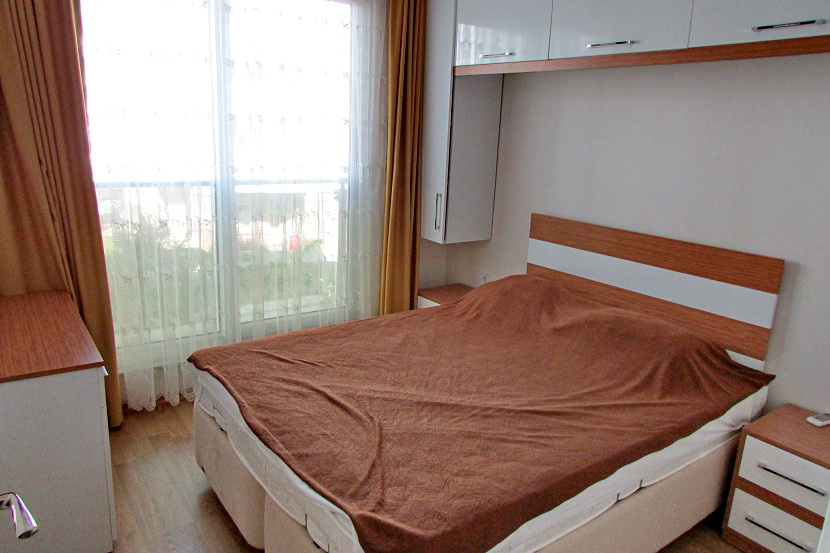 The bedroom has double bed and wardrobes, the conditioner, bed linen, bedside tables, iron with board.