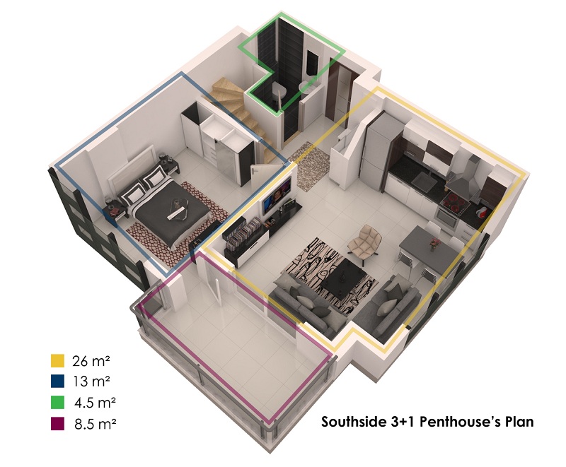 Our Project is in the Kestel district, east of Alanya and it is on approximately 1 decare land. It consists of one block. Our project which includes 10 1+1, 2 3+1 duplex and 3 3+1 penthaus (15 apartments in total) is one of the favorite projects of our Alanya, and it draws attention and is taken as an example. In our project evaluated and developed by us with architects, designers and engineers who are specialists in their fields, the needs and the comfort of our customers are emphasized to the maximum extent and the swimming pool, the sport center, the sauna and the parking lot included in the project are provided to serve you.