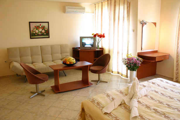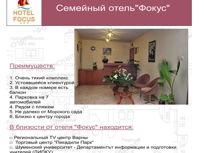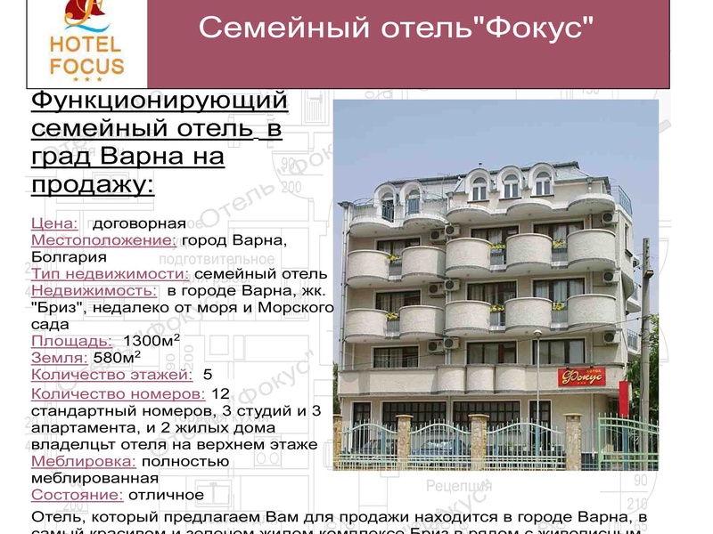 Sale Hotel Focus in Varna, Bulgaria. The hotel is located in the most beautiful and green residential complex Breeze near the picturesque park near the sea and 10 minutes walk from the beach. The strategic location of the hotel Focus allows easy access to every important point of the city -.. 5 minutes to downtown, 20 minutes from the airport, and at popular resorts "Golden Sands" and St. Constantine and St. Helena can be reached within 15 minutes. Put into operation in 2005. Hotel has been operating for 8 years and has an excellent rating in the Internet. The hotel has an area of 580m2, the total area of 1300m2 property. Excellent condition of the hotel, with 12 rooms and 5 floors. The hotel is cost of a basement, ground floor, three floors and an attic. The ground floor comprises: reception, bar and offices. Each floor has its own color. Each floor has 1 suite, 1 studio and 4 standard rooms. Each room has a bathroom with a toilet, a balcony, mini bar, air conditioning, cable TV, telephone and wireless internet. The hotel has a car park with 7 parking places. Advantages include a very quiet complex, well-established clientele, each room has a balcony, not far from the sea garden, close to the city center. Hotel Features: Courtyard, kabelnoe TV, internet, parking, paved road, furniture, grocery shops, off road parking, waste water, electricity, toilet, bathroom, terrace, air conditioning, interior doors, well-kept garden. Price is negotiable.