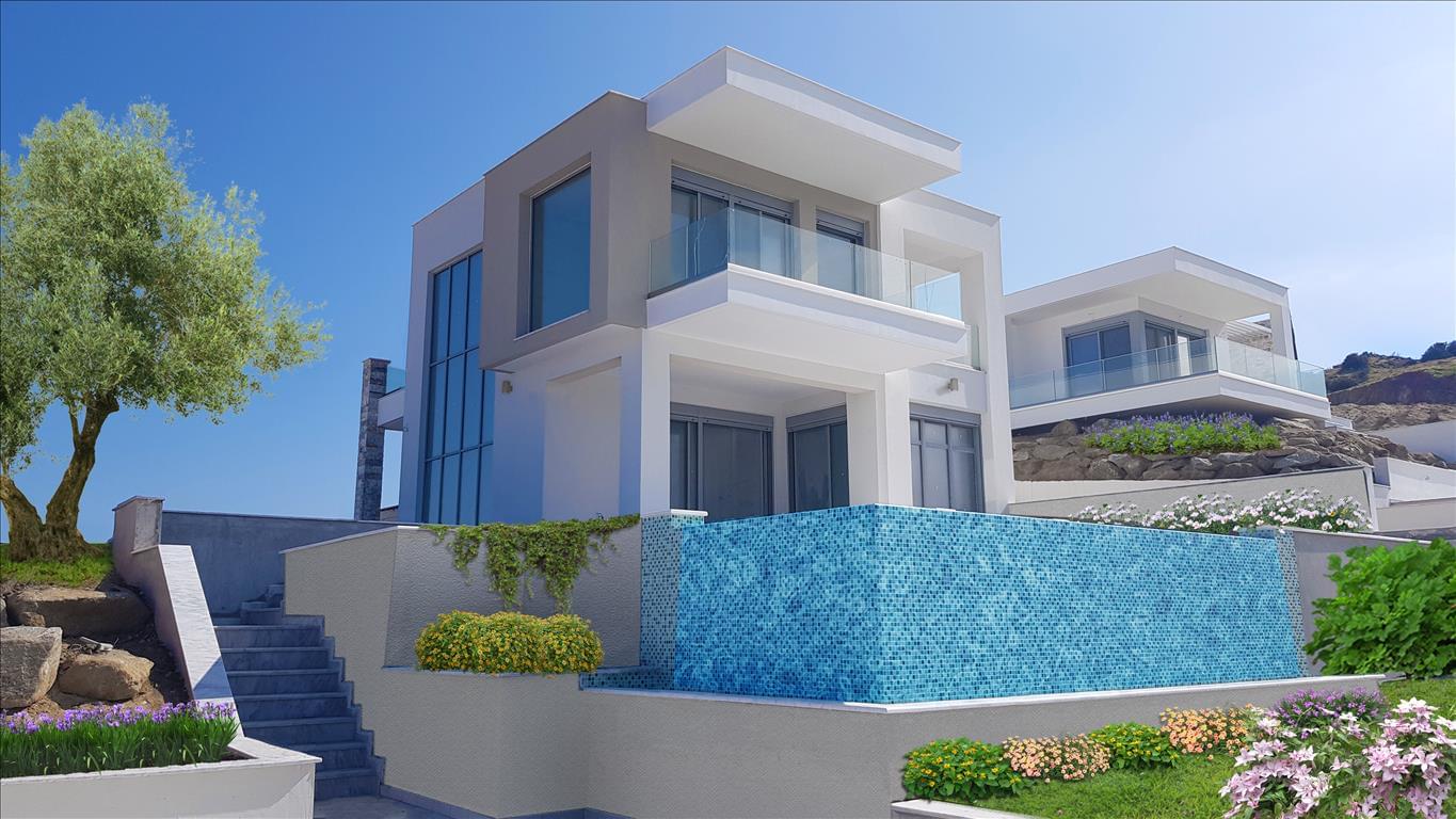 The two-storey villa has an area of ​​150 sq.m. On the first floor there is a spacious living room with a double-light space, a dining room, a kitchen, one bedroom and a bathroom. On the second floor there are 3 bedrooms with private bathrooms and balconies. The master bedroom has panoramic windows with amazing views of Athos, as well as a bathroom with a view of the sea. On the plot there is a swimming pool with Jacuzzi and overflows, a comfortable sofa zone near the pool, organized plots and flower beds, a parking lot at the entrance to the plot.