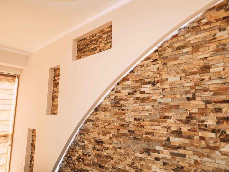 Facade: granite beige firm “Travertine”, three-chamber profiles windows.