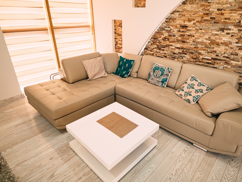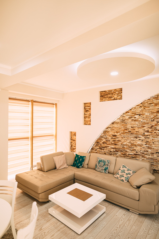 Facade: granite beige firm “Travertine”, three-chamber profiles windows.