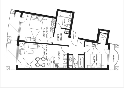 Состоит из гостиной, две спальни, две ванные с туалетом, два гардероба и два балкона.