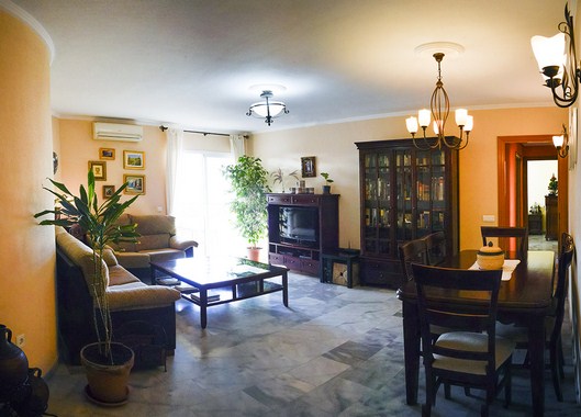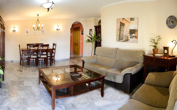 Middle floor flat in a prestigious complex at botanical park La Paloma. It has 3 double bedrooms with fitted-in wardrobes, the master bedroom. has a balcony with panoramic views and en-suite bathroom. Lounge is square and measures 25m2. Has hot / cold air condition and exit to a terrace of 14m2 with panoramic views (gardens, mountains) partial sea views. There is a fully equipped kitchen, a laundry, a storage room of 2m2, a small foyer, a hallway and a bathroom with shower. In the second basement level there is a garage place. The apartment has oak woodwork, white aluminum windows, marble gray marble, fiber optic, communal satellite TV , video intercom and city gas.