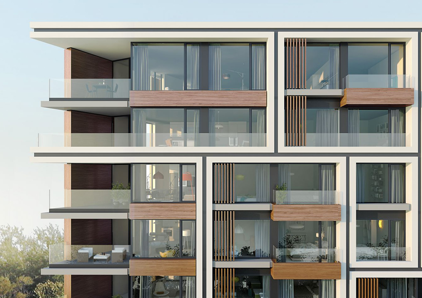 The facade of Alba apartments removes all boundaries and welcomes the sun and the mountains as a daily guest in every home from sunrise to sunset.
