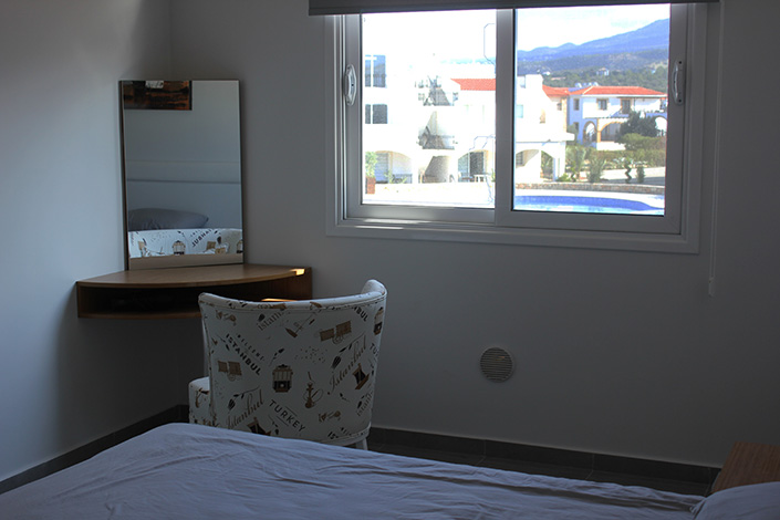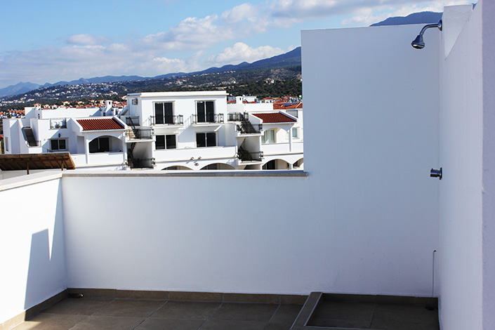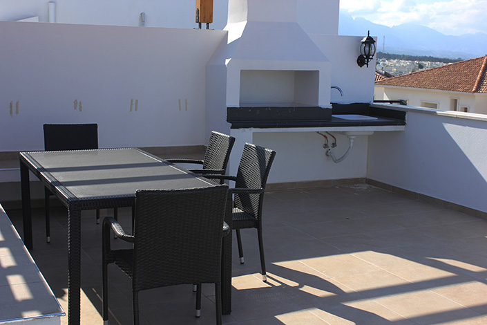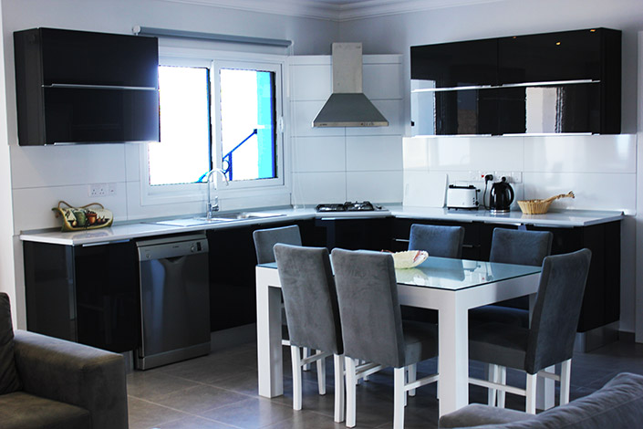 В ванной комнате большая и удобная душевая кабина.Кухня имеет открытую планировку и оборудована всем необходимым. В гостиной и столовой есть удобные, большие диваны. Так же имеется еще одна ванная комната с душевой кабиной. Все комнаты оснащены кондиционерами. Открытая терраса на крыше для отдыха на свежем воздухе. Терраса оснащена встроенным барбекю, что позволяет насладиться едой на свежем воздухе с великолепным видом на закат и море. В апартаментах есть спутниковое телевидение и WiFi. Установленная система отопления дает возможность проживать в данной квартире круглый год.