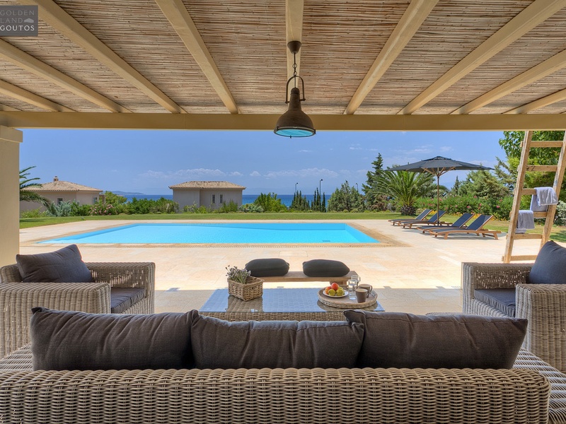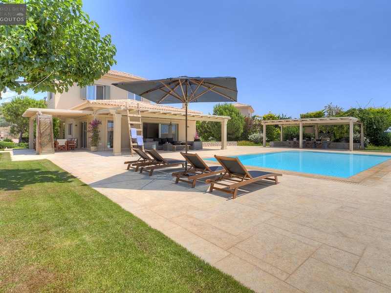The villa is built on a plot of 2,000 sqm which is surrounded by a stone wall, in harmony with the surrounding environment. The house covers a surface of 270 sqm and features five bedrooms with en-suite bathrooms, with views to the sea and the beautiful sunset of Ververonda. It has also a spacious living room with large windows that allow you to enjoy the closeness of garden and swimming pool, a fireplace, marble floors and one wc. It includes also air conditioning as well as heating system for the winter months. At the exterior of the villa the luxurious living areas and the large dining area make for beautiful family moments. The exterior of the villa is similar to that of the other neighboring independent villas that form a small complex of luxurious beach houses. The house extends on two levels, offering a wonderful view to the sea, and in its flourished garden there is a pool, a big pergola and a private corridor leading directly to the beach.