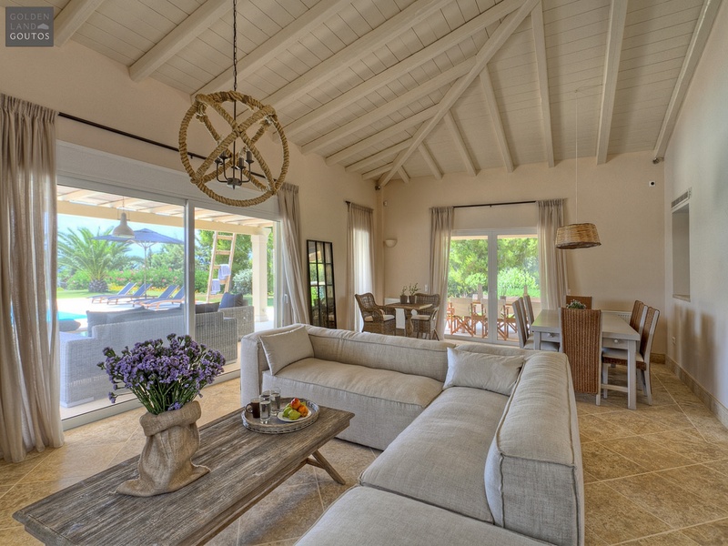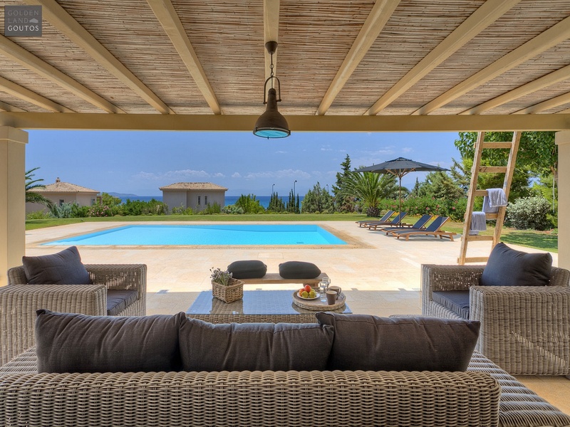 The villa is built on a plot of 2,000 sqm which is surrounded by a stone wall, in harmony with the surrounding environment. The house covers a surface of 270 sqm and features five bedrooms with en-suite bathrooms, with views to the sea and the beautiful sunset of Ververonda. It has also a spacious living room with large windows that allow you to enjoy the closeness of garden and swimming pool, a fireplace, marble floors and one wc. It includes also air conditioning as well as heating system for the winter months. At the exterior of the villa the luxurious living areas and the large dining area make for beautiful family moments. The exterior of the villa is similar to that of the other neighboring independent villas that form a small complex of luxurious beach houses. The house extends on two levels, offering a wonderful view to the sea, and in its flourished garden there is a pool, a big pergola and a private corridor leading directly to the beach.