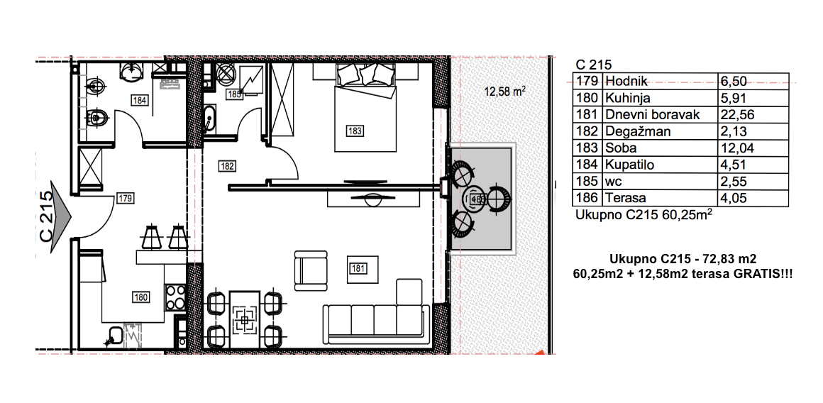1-bedroom apartment № C215 on 2 floor ( high 4) , total area 60,25 м2 + 12,58 m2 terrace with landscaping as a gift in an exclusive multi-complex «Porto Budva» with a shopping center of 8000 sq.m and a SPA-center 3500 sq.m with a wide range of services, with the medical center, with indoor and outdoor pools!