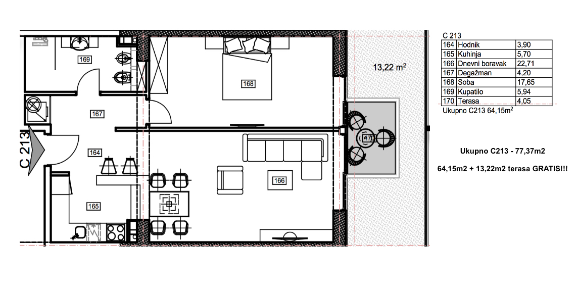 1-bedroom apartment № C213 on 2 floor ( high 4) , total area 64,15 м2 + 13,22 m2 terrace with landscaping as a gift in an exclusive multi-complex «Porto Budva» with a shopping center of 8000 sq.m and a SPA-center 3500 sq.m with a wide range of services, with the medical center, with indoor and outdoor pools!