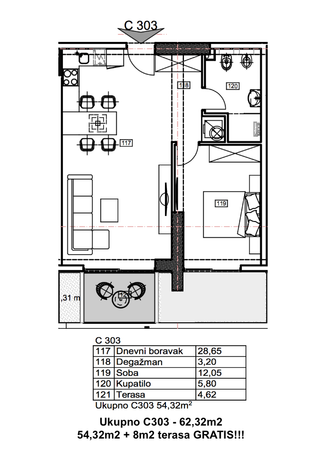 2-bedroom apartment number C303 in an exclusive multi-complex «Porto Budva» with a shopping center of 8000 sq.m and a SPA-center 3500 sq.m with a wide range of services, with a conference hall and a restaurant, with indoor (20mx8mx1.8m) and outdoor pools (28mx20mx1.8m)!