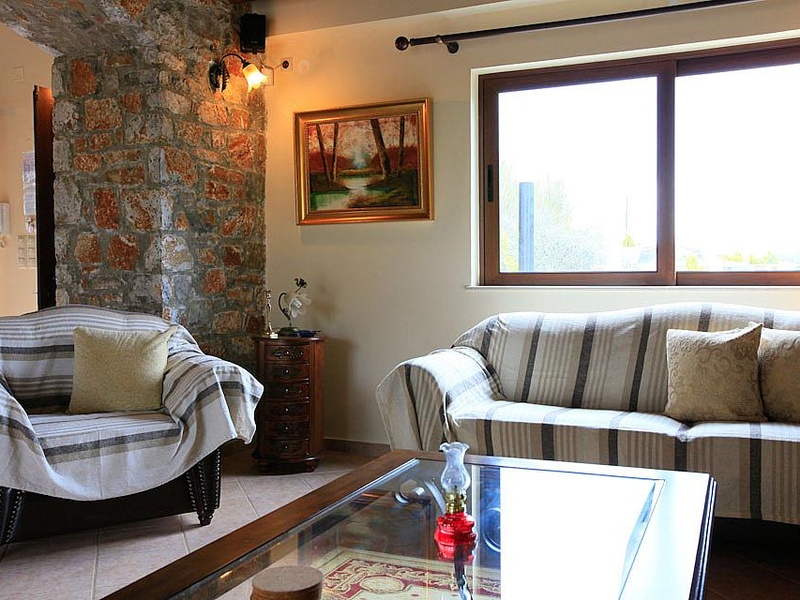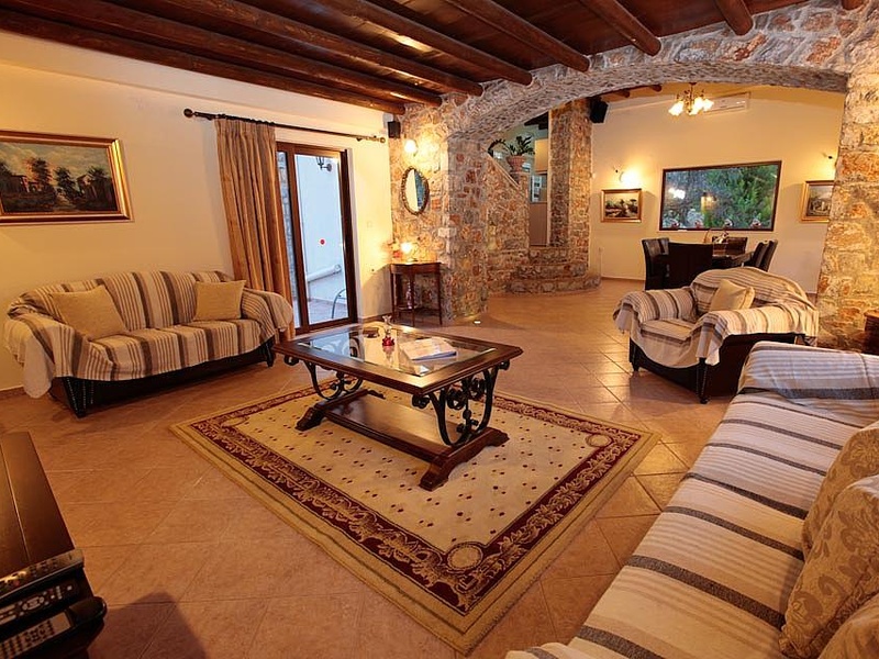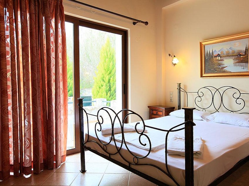 On the first floor is a double bedroom and a large bedroom with double bunk beds (suitable for 4 children), along with a large family bathroom. A door leads out to a private terrace with the mosaic tiled pool and sea views.The living room has comfortable sofas, WiFi Internet, Satellite TV, DVD player, ornamental fire place and valuables safe.The kitchen features: full oven, cooking hob, fridge/freezer, microwave, dishwasher and washing machine.Villa Melina has 3 air conditioned bedrooms:
