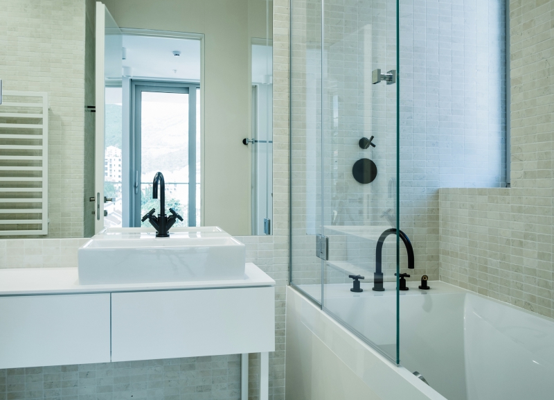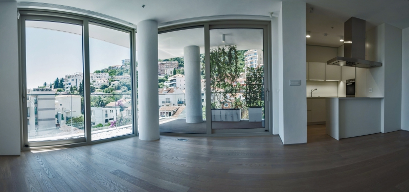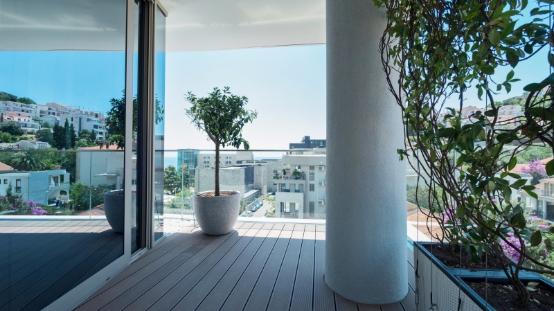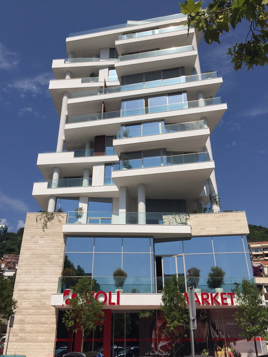 Апартаменты имеют современный дизайн и прекрасную качественную отделку. В отделке используется итальянская керамическая плитка, итальянский паркет из натуральной древесины на многослойной основе из клееной фанеры, черногорский напольный камень "Maljat".
