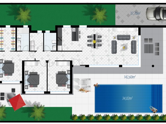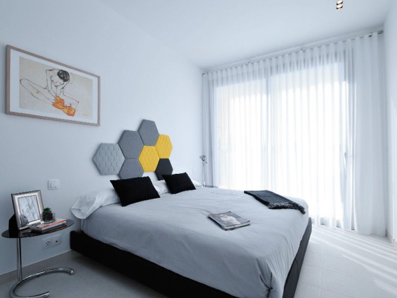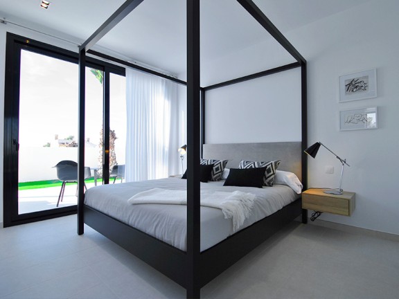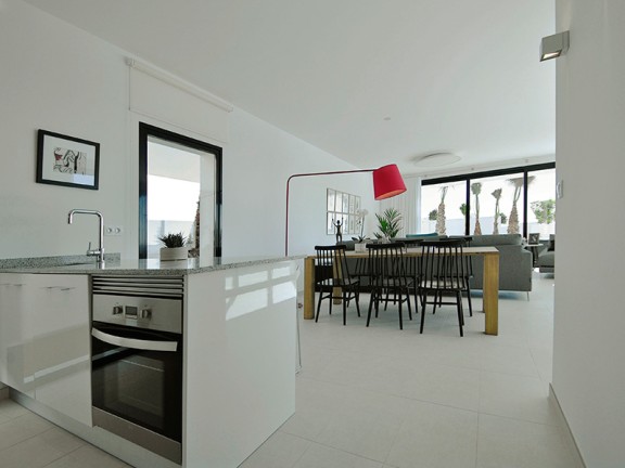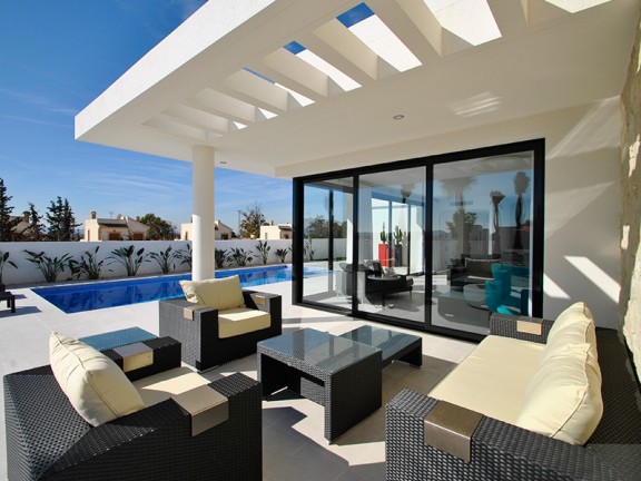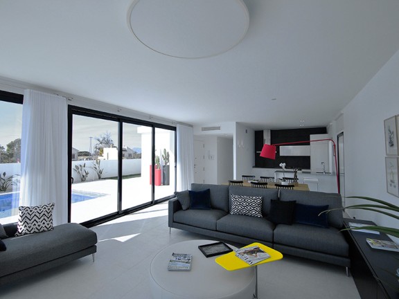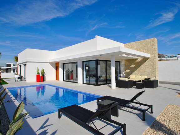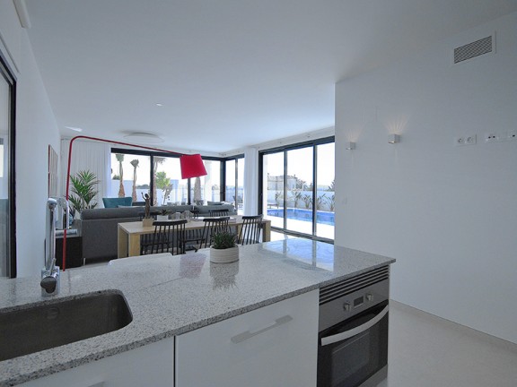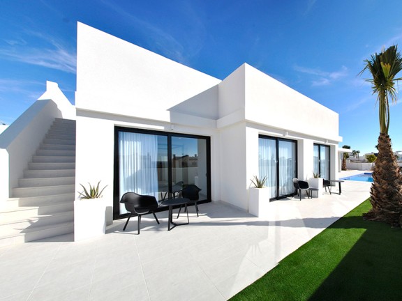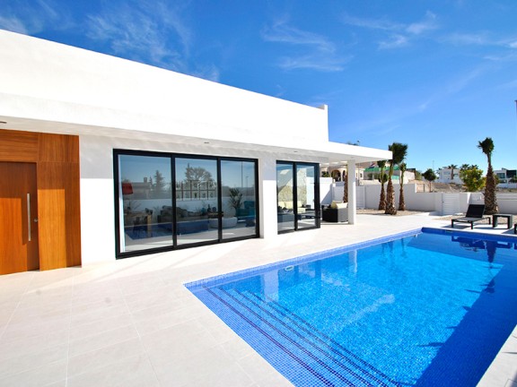 For sale modern villa with private pool on the Costa Blanca (south), a strip of the Mediterranean coast of Spain, Alicante province, autonomous community of Valencia. Zone of tourism and recreation. The villa was built in 2016, it has 4 rooms, 3 bedrooms, 2 bathrooms. The living area of the villa is 140 square meters plot of 500 square meters, parking. The villa is equipped with an alarm system, a terrace with wonderful mountain views, air conditioning, swimming pool, cellar, garden, balcony, kitchen. This is a new development of luxury villas, consisting of a spacious living area, fully equipped kitchen, bedrooms, bathrooms. These new and very elegant, excellent properties are built in a prime location, on the Costa Blanca South, are prized for their beautiful location and sunny weather throughout the year. Several golf courses and shopping centers and sandy beaches which can be reached within a few minutes drive away and the motorway are 6 to 7 minutes. A trip to Murcia airport is less than 50 minutes to Alicante airport about 20 minutes. The situation at home ensures maximum sunlight and comfort.
