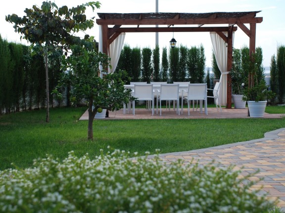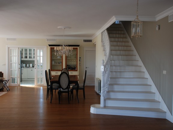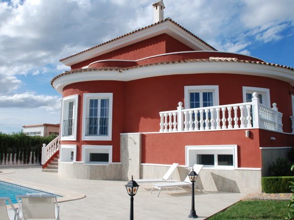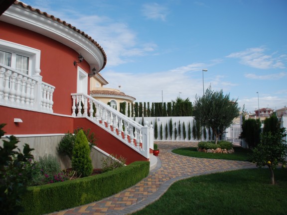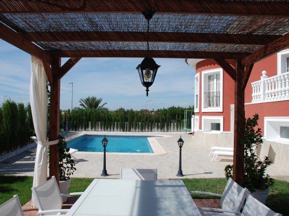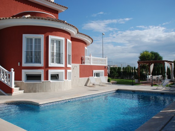 For sale a luxury villa on the Costa Blanca (south), a strip of the Mediterranean coast of Spain, Alicante province, autonomous community of Valencia. Zone of tourism and recreation. The villa was built in 2008, it has 5 bedrooms, 4 bathrooms. The living area of the villa is 415 square meters plot of 700 square meters, parking. The villa is equipped with an alarm system, fireplace, terrace, guest apartment, a basement, a view of the lake, the garden, the sea. Independent family house of modern design on a private plot of 700m2. This house has an area of 415m2. The second floor has a large terrace of 30m2. The house has 5 bedrooms, 4 bathrooms, living room, kitchen, garden and private parking, private pool. The house is equipped with the latest in the field of energy saving technologies, centralized aerial - conditioning. In 2014 the house was completely renovated inside and out. It is sold equipped with appliances and furniture. Of course, the house has been renovated to the highest standards in a quiet and safe area. The house is located close to the lake and a short walk from the shopping center, bars, restaurants, supermarkets, etc .. The beautiful sandy beaches of Guardamar del Segura and Torrevieja are only 10 and 15 minutes respectively. Golf lovers will feel comfortable next to the beautiful golf course La Marquesa (Ciudad Quesada) and La Finca (Algorfa).