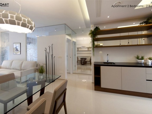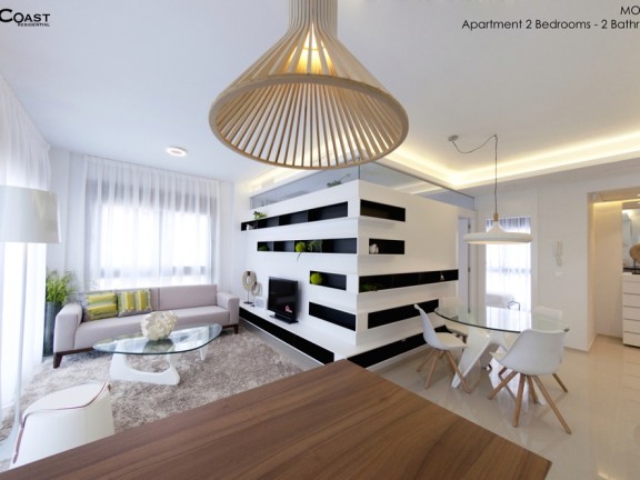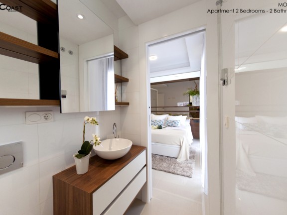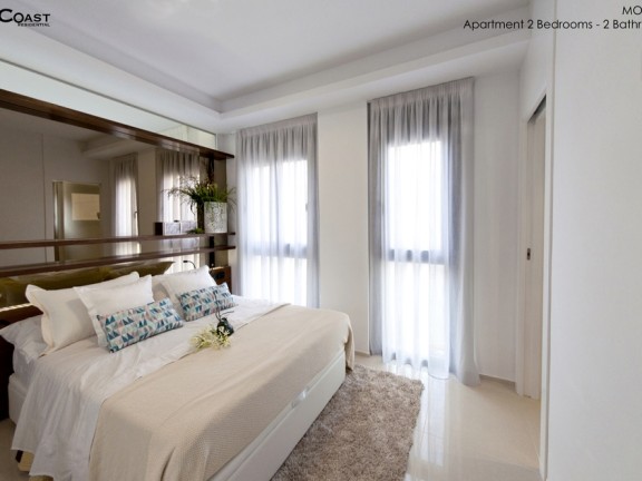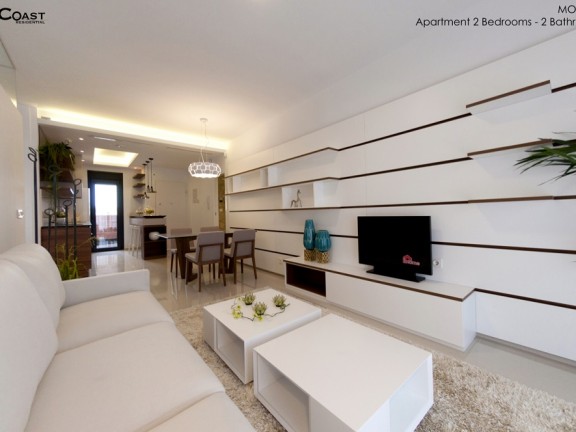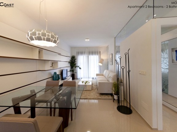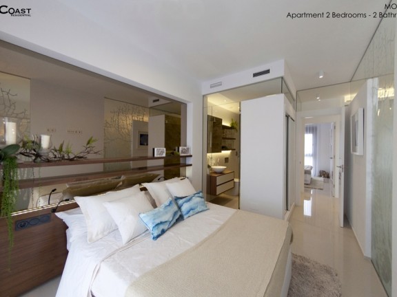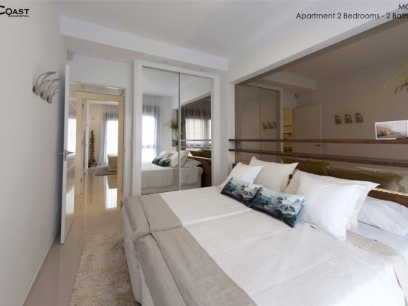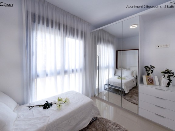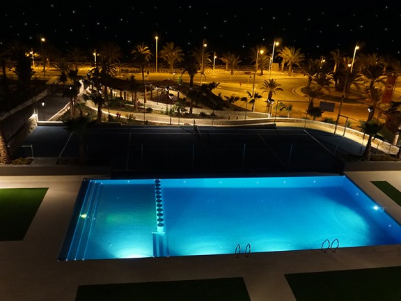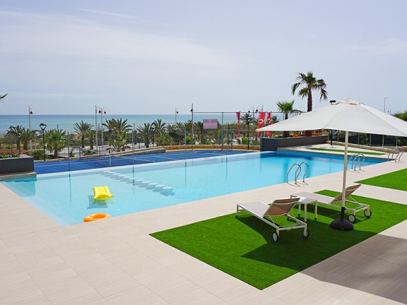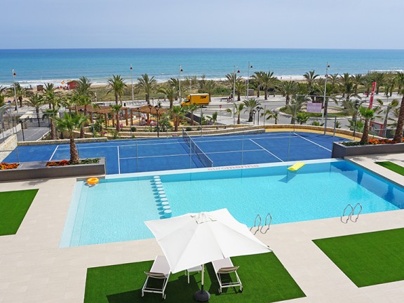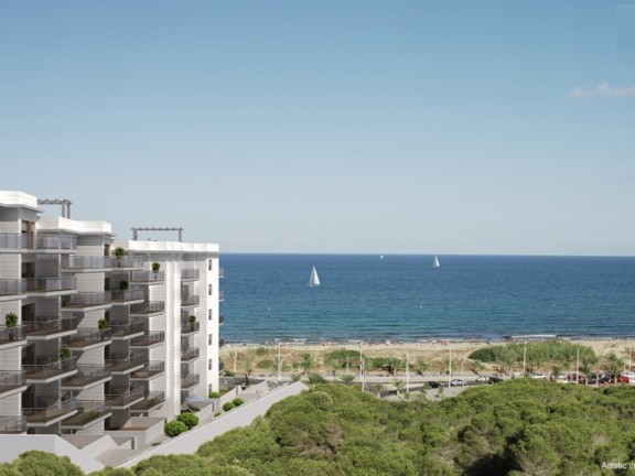 Flat for sale on the first line of the Mediterranean Sea on the Costa Blanca (south), a strip of the Mediterranean coast of Spain, Alicante province, autonomous community of Valencia. Zone of tourism and recreation. The apartment was built in 2015, it has 3 bedrooms, 2 bathrooms. The living area is 57 square meters, the total area of 67 square meters and a terrace of 7 square meters, parking. There is an elevator and a terrace overlooking the beach, air conditioning, swimming pool, gym, tennis court, garden with sea views. The body is composed of various types of models, apartments with garden, apartments with terrace or apartments with solarium. They have 2-3 bedrooms and 2 bathrooms, fully equipped with induction hob and extractor hood, a large living room which gives access to the indoor and outdoor terrace. The most demanding people will be satisfied in this complex with stunning views of the Mediterranean Sea; easy access to shops, restaurants and entertainment centers.