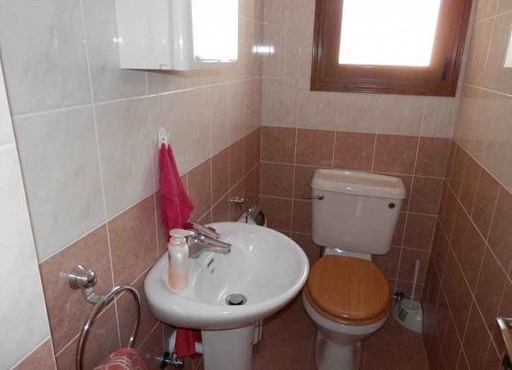 На первом этаже дома расположены: просторная гостиная с выходом на террасу и к бассейну, полностью укомплектованная кухня, подсобная комната-прачечная, гостевой туалет, кладовка и офис (который может использоваться как четвертая спальня).