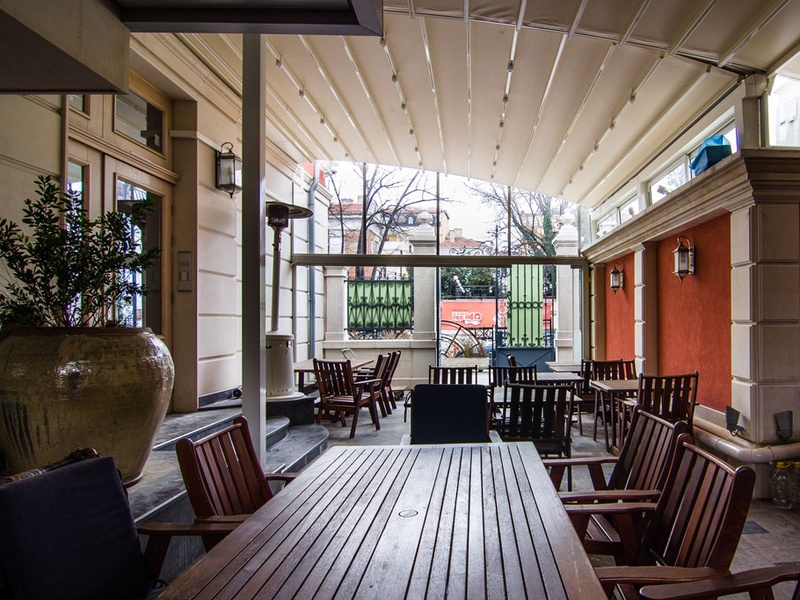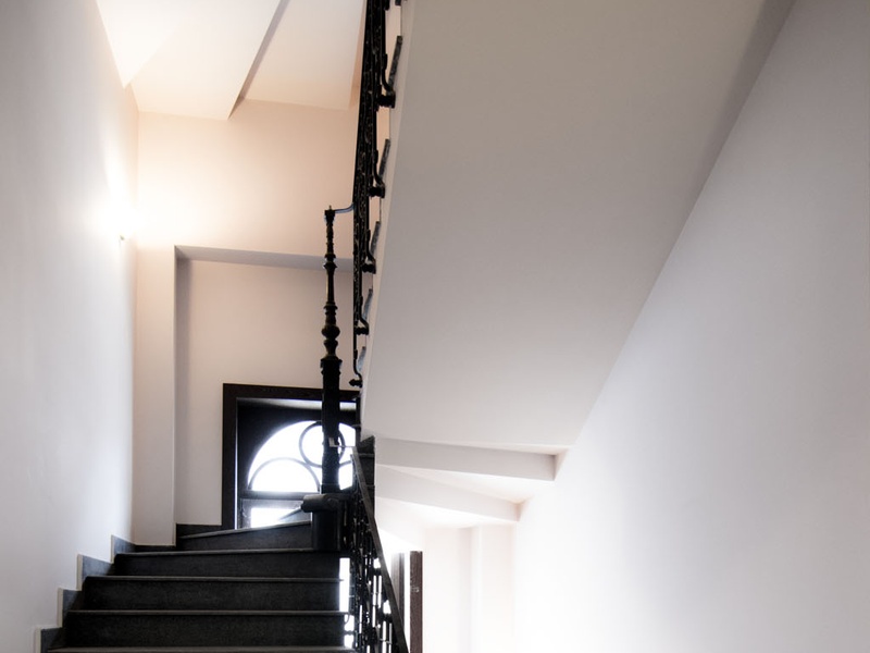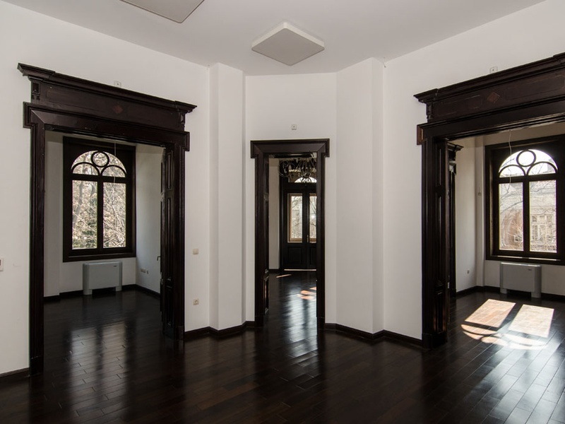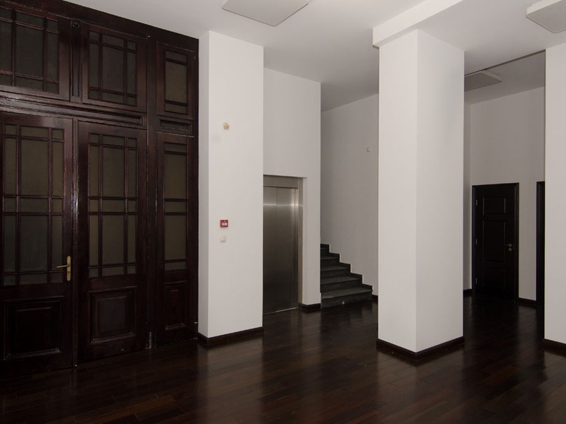 ПАРТЕР: Площадь застройки – 358 кв.м; высота помещений - от 2,53 м до 4,30 м; толщина стен – 60 см; напольное покрытие из массивного паркета из грецкого ореха; у входа в лифт и пол туалетов покрыты полированным голубым камнем; двери официального подъезда в партере выработаны из массивной древесины (американский выбеленный дуб); потолок - также прусский свод под бетонной плитой; прусский свод сохранен как декоративная часть аутентичной внутренней архитектуры, сохранен и оригинальный парапет лестницы (кованое железо); туалеты в партере сделаны также как и в цокольном этаже – 1 дамский, 1 мужской, 1 для инвалидов; с партера начинается шахта лифта и продолжает до последнего третьего уровня, вместимость лифта – 6 человек, возможно пользование инвалидами; в партере дома 5 отдельных входов: 1 – центральный (на углу улиц «Братья Шкорпил» и «Антим I»), 2 – вход с западного фасада к офисной части, 3 – вход с западного фасада к лифту, 4 - вход с западного фасада к партеру , 5 – самостоятельный вход со двора к цокольному этажу (эвакуационный выход); двери всех входов выработаны из массивной древесины (американский выбеленный дуб);