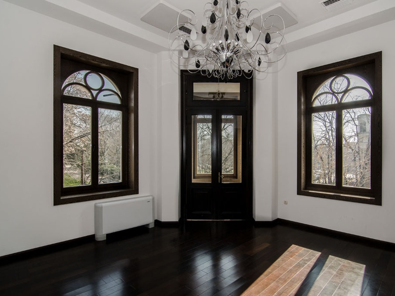 Окна и двери всего здания - из массивной древесины (снаружи - американский выбеленный дуб, внутри – венге); стеклопакет – энергосберегающие стекла, цвет - суперсильвер, два слоя по 6 мм.