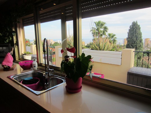 Beautiful penthouse with panoramic views towards the sea. Bright, all exterior, two double bedrooms with fitted-in wardrobes, one with balcony (sea view), the other with large bathroom en suite, ,jacuzzi bath tub and exit to a private terrace of about 20m2. Second bathroom with shower. Living room with embedded halogen lights and exit to the large main terrace of about 50m2 with beautiful views. Spacious, family size designer kitchen, fully equipped and with big windows and sea views.