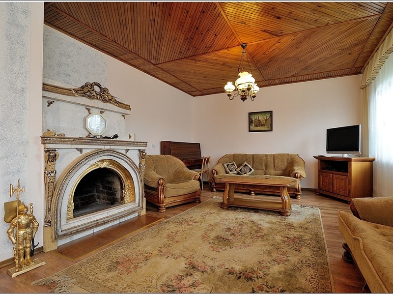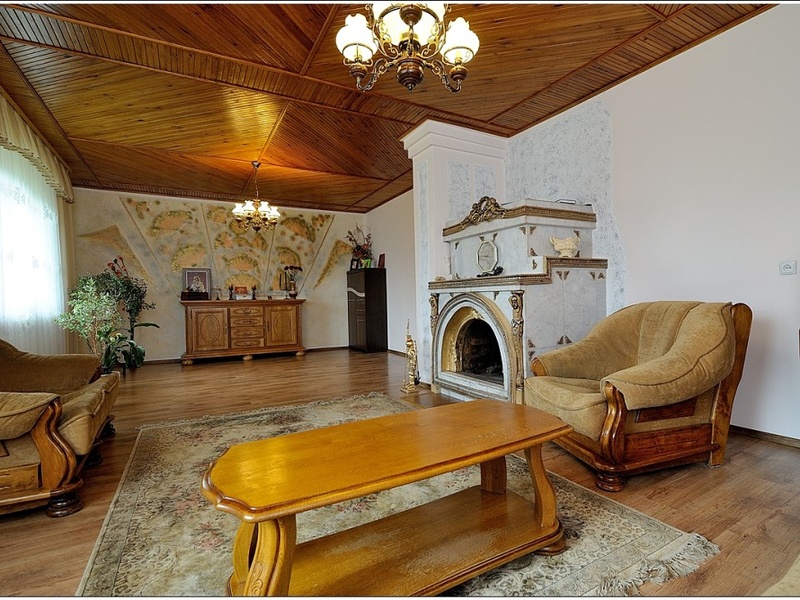 – На первом этаже – кухня, гостиная с камином, холл, туалет и душевая отдельно и веранда. На втором этаже – комната отдыха, спальня и 3 чердака. В подвале – котельная, помещение для дров, 2 склада, комната отдыха и холл.