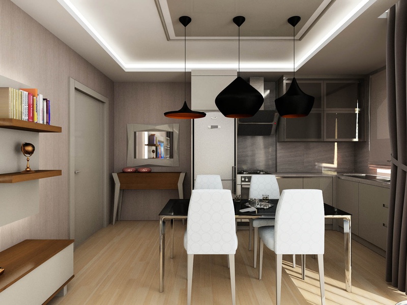В кухне – встроенная лакированная мебель из МДФ, рабочая поверхность – гранит, поверхность кухонного фартука отделана плиткой;