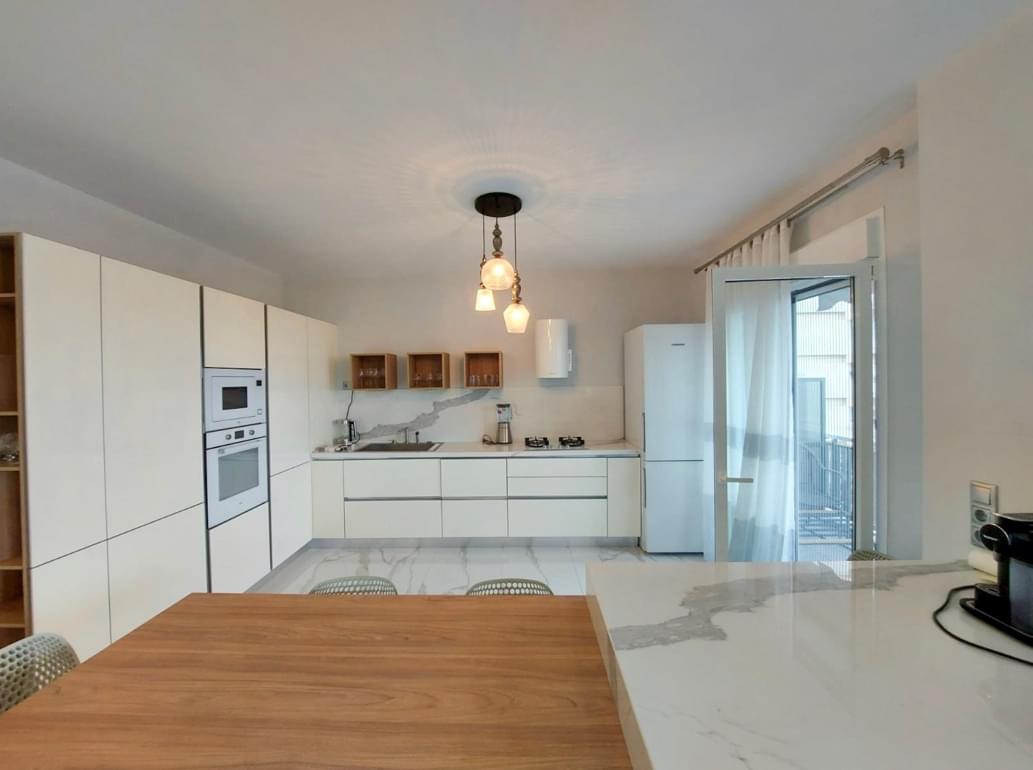 В квартире установлена кухонная мебель и встроенные шкафы в спальне, входная дверь - бронированная. За таунхаусом закреплено парковочное место на паркинге. Территория комплекса благоустроена, имеется парковка, много зелени.