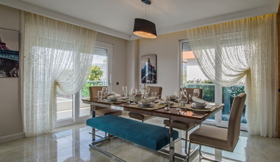 Панорамные двери выходят к бассейну размером 30 м² с террасой с шезлонгами. Стильный лаунж возле бассейна идеально подходит как для повседневного обеда, так и для романтического ужина, где можно разместиться, попивая коктейль, вдыхая воздух Таврийских гор.
