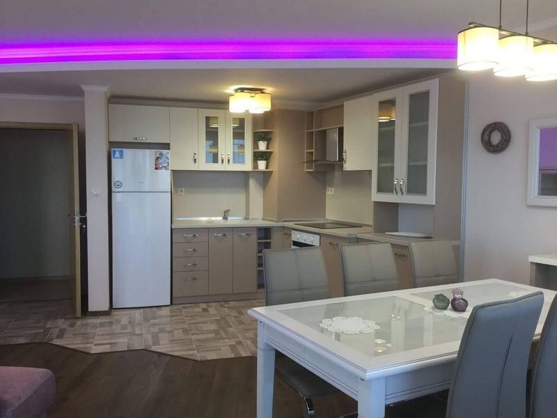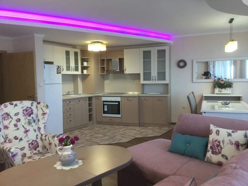 Апартаменты предлагаются на продажу как в готовом виде «под ключ»,так и без ремонта, с отделкой по БДС/болгарский гос. страндарт/ — гипсовая шпаклевка стен, напольная стяжка, межкомнатные двери, бронированная входная дверь, металлопластиковые окна, центральное водоснабжение и электропроводка, индивидуальные счетчики (свет и вода).По желанию клиента за дополнительную плату возможно сделать отделку и мебелирование апартамента за 2-3 месяца.